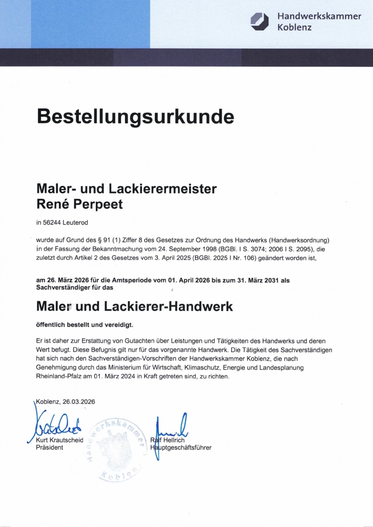 Der öffentlich bestellte und vereidigte Sachverständige im Maler- und Lackiererhandwerk besitzt herausragende Qualifikationen, um die Qualität von Beschichtungen zu beurteilen und die Ursachen von Leistungsstörungen zu identifizieren. Darüber hinaus ist er in der Lage, fundierte Sanierungskonzepte zu entwickeln.